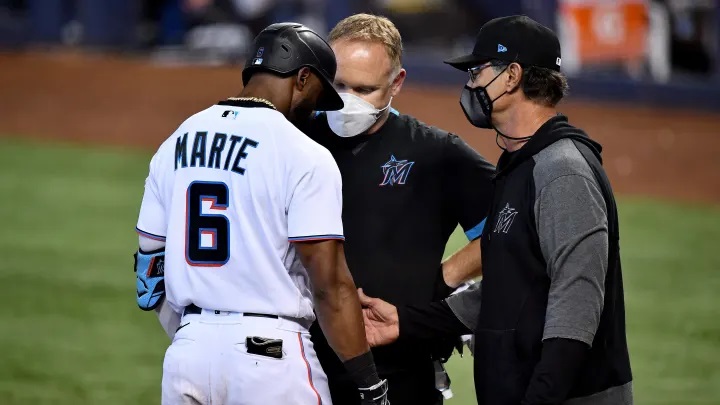 Marte salió en medio de su turno del noveno inning en la derrota del domingo de Miami por 1-0 ante los Gigantes en el loanDepot park. Llamó la atención del cuerpo técnico cuando empezó a tocarse el costado y fue visitado cerca de la caja de bateo por el manager Don Mattingly y el trainer Gene Basham, luego de dejar pasar una curva de Tyler Rogers.